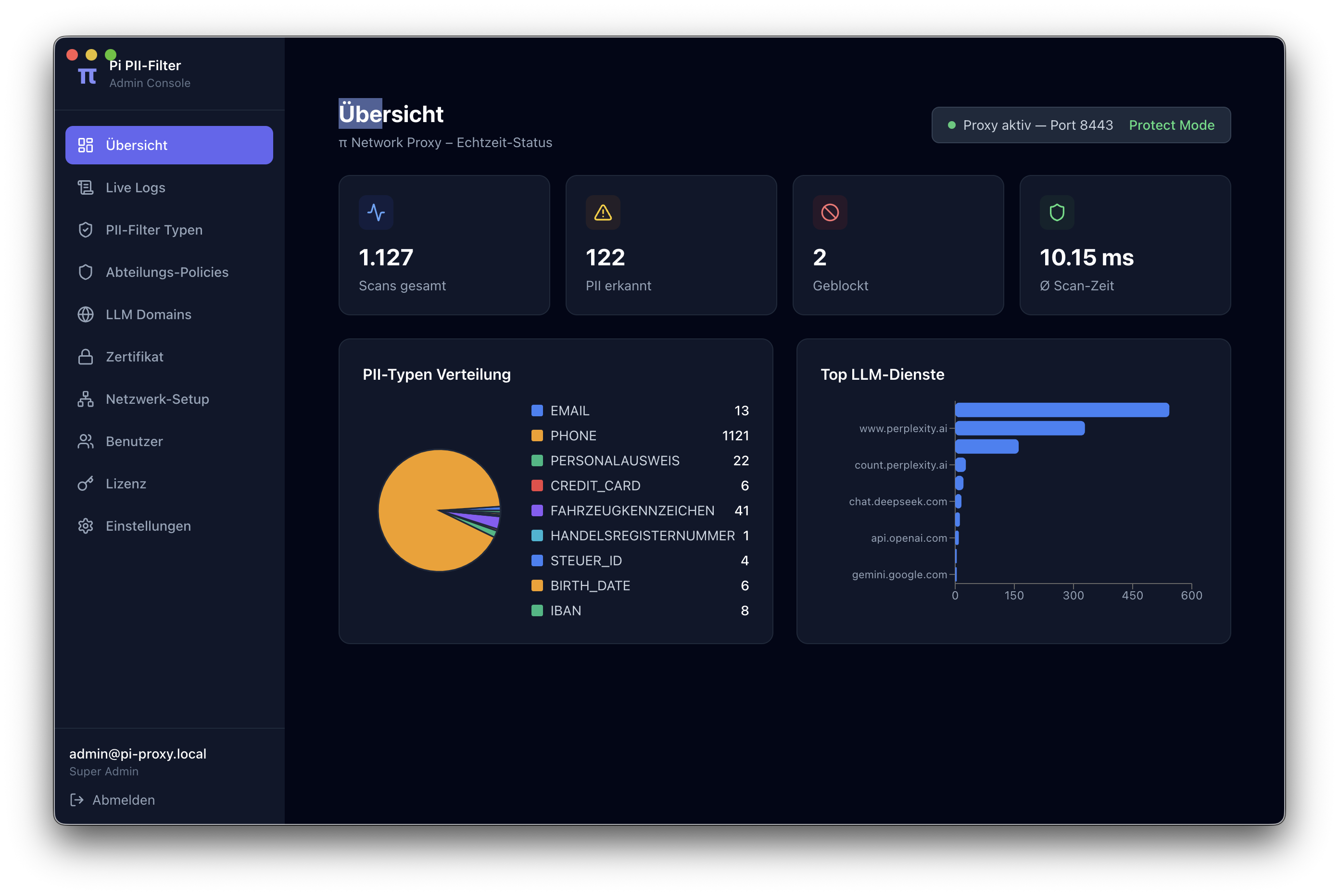Jede abgefangene LLM-Anfrage in einer filterbaren Tabelle — Zeitstempel, erkannte PII-Typen und der angewandte Schutzmodus pro Zeile. Entwickelt für Compliance-Beauftragte, die Nachweise brauchen, keine Versprechen.