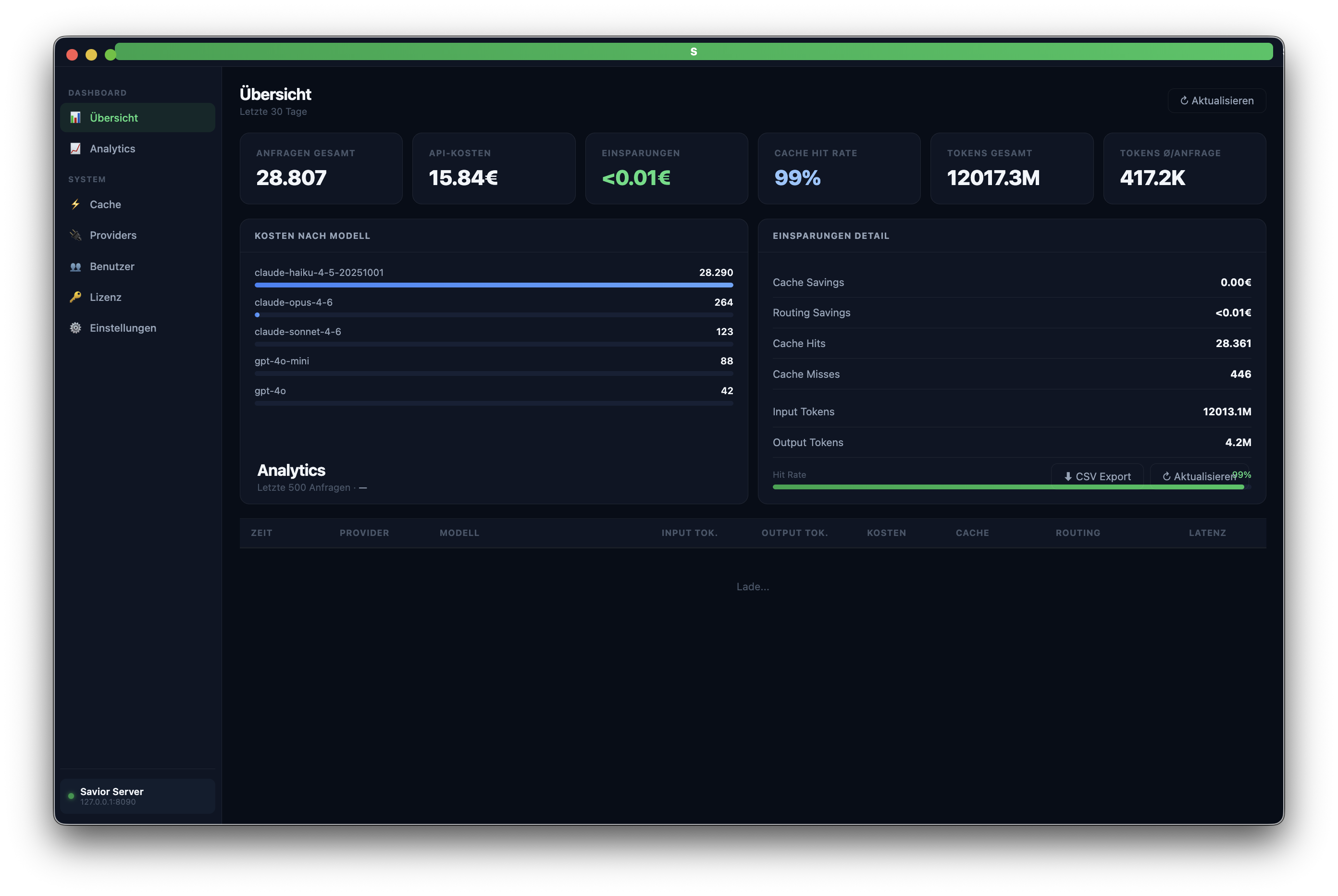 Savior routet automatisch, cached identische Anfragen und liefert detaillierte Kostenreports.
